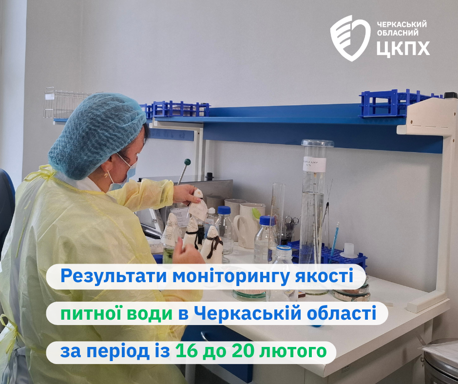 У межах щоденного моніторингу якості та безпечності питної води ДУ «Черкаський обласний ЦКПХ МОЗ України» за період із 16 до 20 лютого 2026 року із джерел та мереж централізованого водопостачання відібрано та досліджено 152 проби питної води за мікробіологічними показниками та 129 – за санітарно-хімічними.