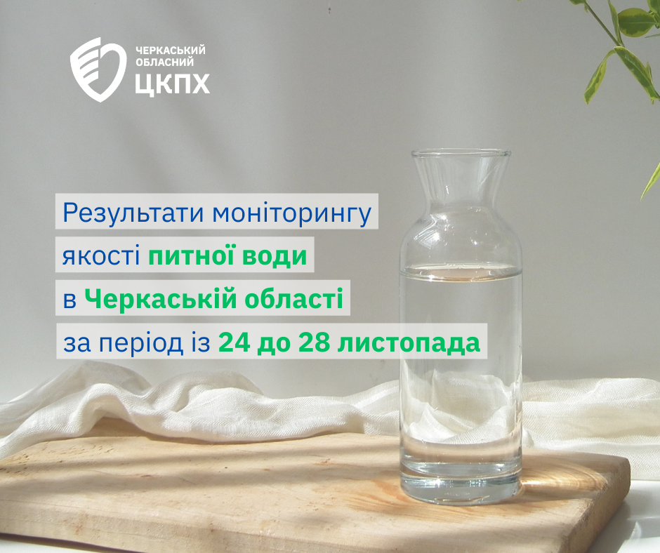 У межах щоденного моніторингу якості та безпечності питної води ДУ «Черкаський обласний ЦКПХ МОЗ України» за період із 24 до 28 листопада 2025 року із джерел та мереж централізованого водопостачання відібрано та досліджено 143 проби питної води за мікробіологічними показниками та 119 – за санітарно-хімічними.