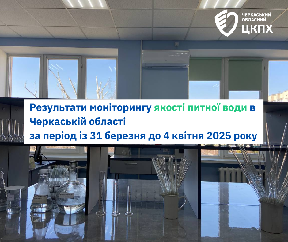 У межах щоденного моніторингу якості та безпечності питної води ДУ «Черкаський обласний ЦКПХ МОЗ України» за період із 31 березня до 4 квітня 2025 року із джерел та мереж централізованого водопостачання відібрано та досліджено 122 проби питної води за мікробіологічними показниками та 102 за санітарно-хімічними.