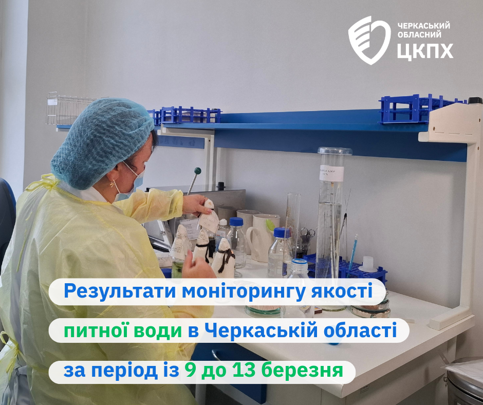 У межах щоденного моніторингу якості та безпечності питної води ДУ «Черкаський обласний ЦКПХ МОЗ України» за період із 9 до 13 березня 2026 року із джерел та мереж централізованого водопостачання відібрано та досліджено 152 проби питної води за мікробіологічними показниками та 149 – за санітарно-хімічними.
