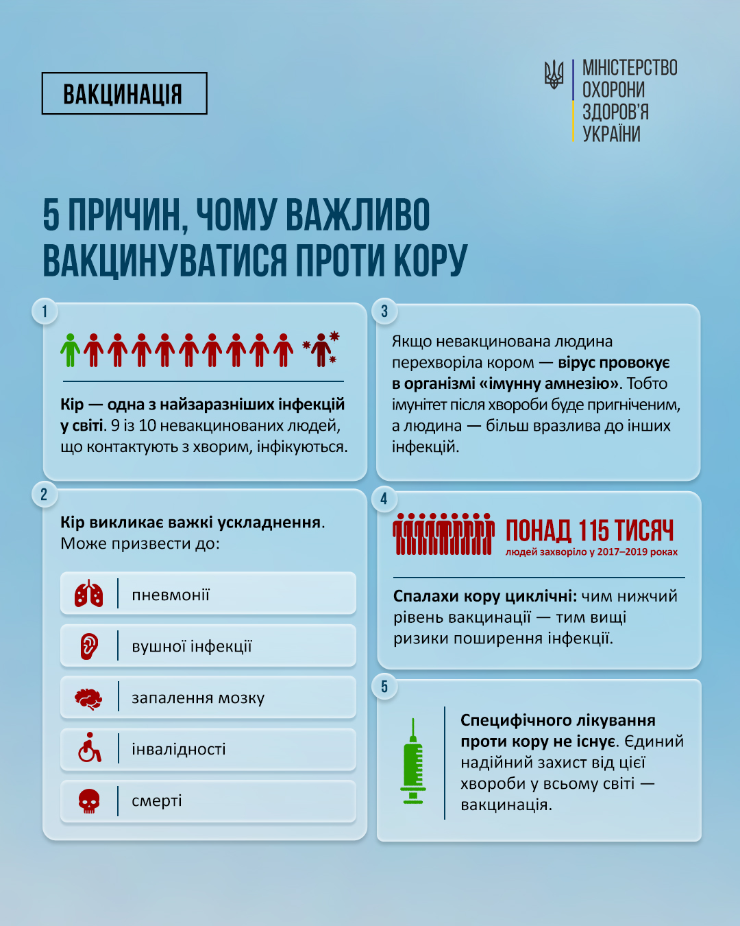 Спалахи кору циклічні: чим нижчий рівень вакцинації — тим вищі ризики швидкого поширення інфекції. Під час спалаху кору в Україні у 2017–2019 роках захворіло понад 115 тисяч людей, 41 людина померла.