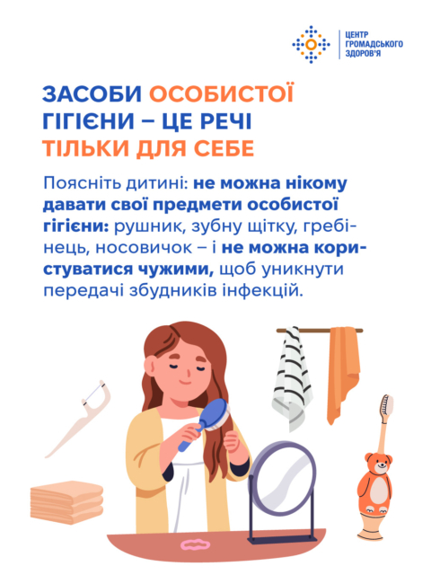 - Засоби особистої гігієни — це речі тільки для себе. Поясніть дитині, що не можна нікому давати свої рушник, зубну щітку, гребінець, носовичок і самому користуватися чужими, тому що це може призвести до передачі бактерій та вірусів, які викликають інфекції, і ризику підхопити хворобу.