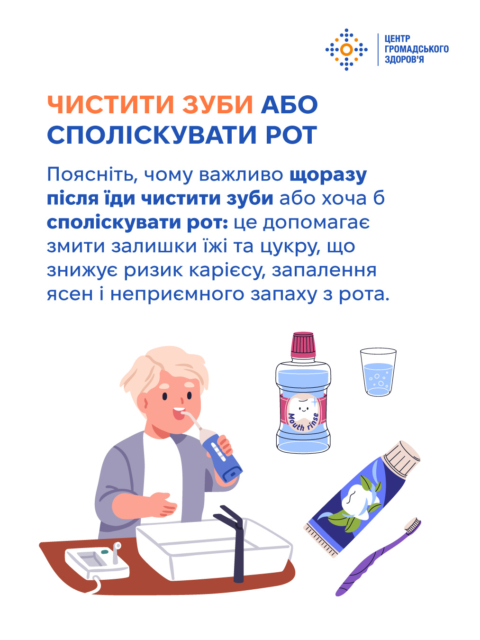 - Чистити зуби або споліскувати рот. Навчіть дитину чистити зуби двічі на день по 2–3 хвилини неабразивною зубною пастою (відповідно до віку). Також важливо чистити зуби або хоча б споліскувати рот щоразу після їди — це допомагає змити залишки їжі та цукру, які стають живильним середовищем для бактерій, і відповідно, знижує ризик карієсу, запалення ясен і неприємного запаху з рота.