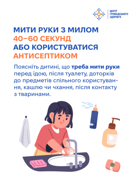 - Мити руки з милом 40–60 секунд або користуватися антисептиком, якщо немає можливості помити руки. Поясніть дитині, що руки слід мити перед їдою, після туалету, доторків до предметів спільного користування (дверні ручки, парти, кнопки), ігор, кашлю чи чхання, після контакту з тваринами. Мити руки треба теплою водою, комфортною для шкіри, — надто холодна може бути неприємна й викликати небажання мити руки достатньо довго, а надто гаряча — подразнити шкіру. Милити треба скрізь — між пальцями, під нігтями, тильний бік долонь. Висушувати руки слід особистим рушником або одноразовою серветкою.