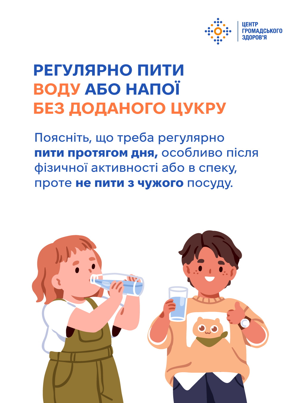 - Регулярно пити воду або напої без доданого цукру. Обов’язково дайте дитині з собою до школи пляшку питної води. Поясніть дитині, чому важливо регулярно пити протягом дня, особливо після фізичної активності або в умовах спеки. Пити з чужої пляшки або склянки не слід, щоб уберегтися від бактерій і вірусів, які можуть передаватися від інших людей.
