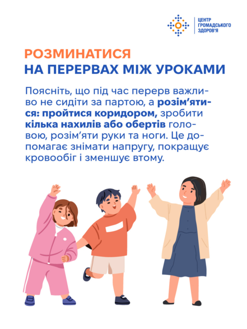 - Розминатися на перервах між уроками. Поясніть дитині, що під час перерв важливо не сидіти за партою, а розім’ятися. Поради: пройтися коридором, зробити кілька нахилів або обертів головою, розім’яти руки та ноги, присісти або зробити кілька присідань. Це допомагає знімати напругу, покращує кровообіг і зменшує втому.