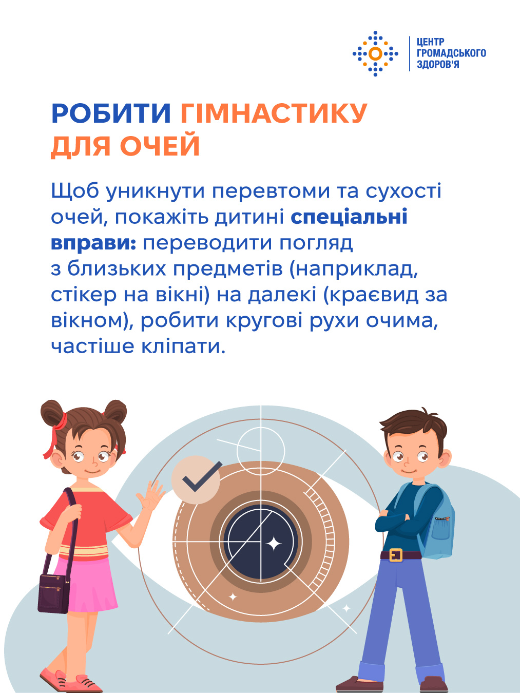 - Робити гімнастику для очей. Щоб уникнути перевтоми та сухості очей, покажіть дитині спеціальні вправи. Можна переводити погляд з близьких предметів (наприклад, стікер на вікні) на далекі (краєвид за вікном), робити кругові рухи очима, частіше кліпати.