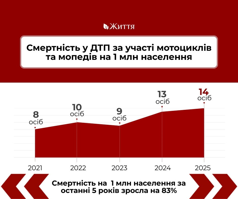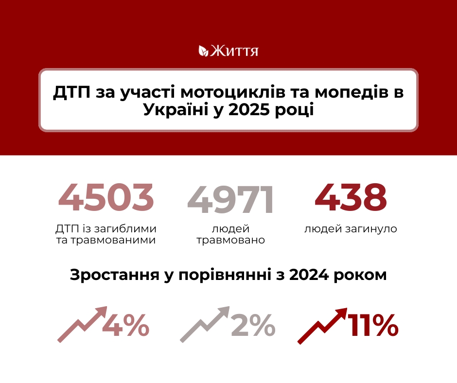 У 2025 році ситуація з безпекою користувачів мототранспорту в Україні помітно погіршилася. У порівнянні з 2024 роком, у минулому році кількість ДТП за участі мотоциклів та мопедів зросла на 4%, травмованих на 2%, а загиблих на 11%. Таким чином кожна десята аварія завершувалася загибеллю людини.