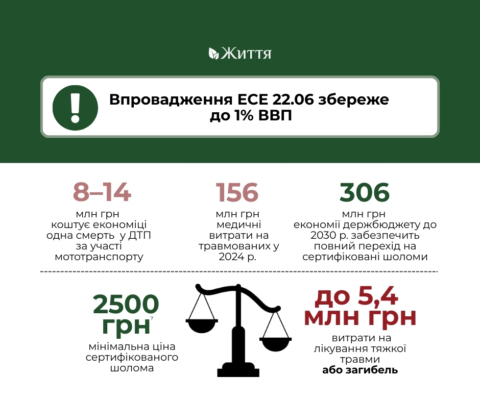 Фінансовий вимір проблеми також вагомий: одна смерть у ДТП коштує державі від 4,7 до 14,4 млн грн, а повний перехід на сертифіковані шоломи може забезпечити економію до 306 млн грн до 2030 року.