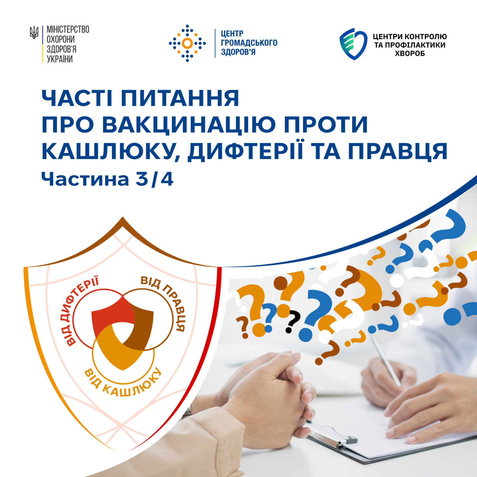 Експерти Центру громадського здоров’я підготували відповіді на поширені питання про вакцинацію проти кашлюку, дифтерії та правця у рамках кампанії з додаткових заходів з імунізації проти цих хвороб для груп населення, які пропустили планові щеплення в попередні роки, та яким необхідно їх надолужити.
