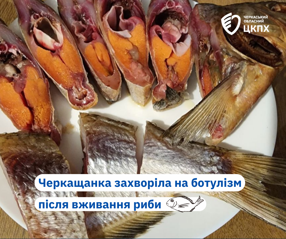 Жінка захворіла після вживання риби в’ялено-копченої (лящ) з ікрою, виготовленої в домашніх умовах. Рибу вона придбала на стихійному ринку поблизу автотраси Золотоноша-Черкаси.