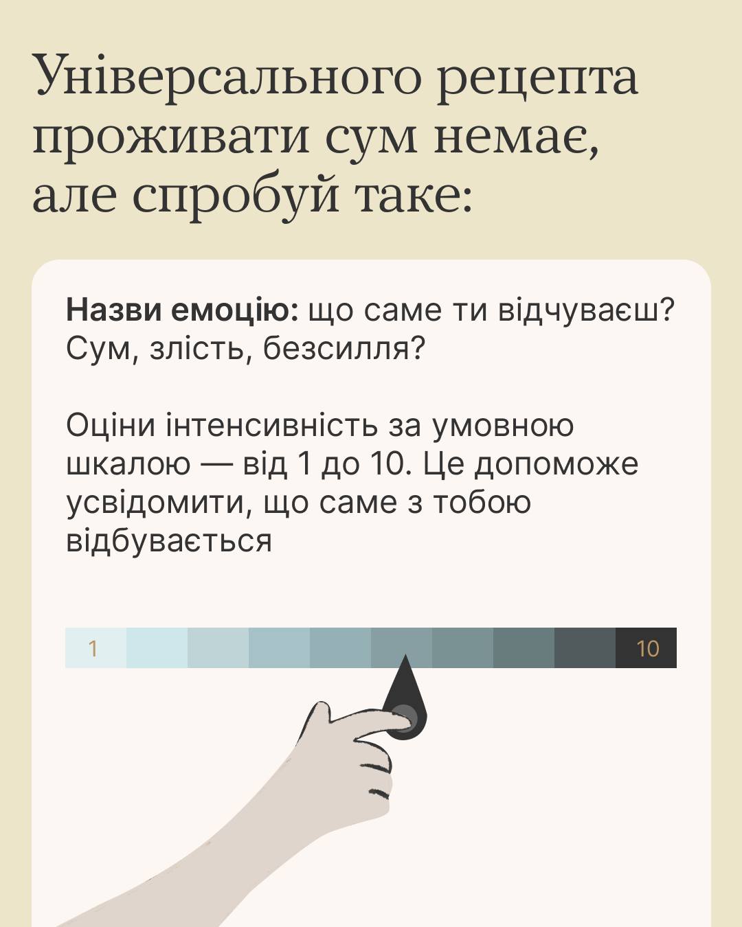 Назвіть, що саме ви відчуваєте. Зупиніться та спробуйте визначити, який відтінок суму ви відчуваєте. Це може бути відчуття безнадійності, скорботи, пригнічення чи туги. Після цього спробуйте визначити, наскільки сильно ви відчуваєте цю емоцію. Скористайтеся шкалою від 1 до 10, де десять — це її найсильніший прояв.