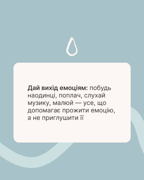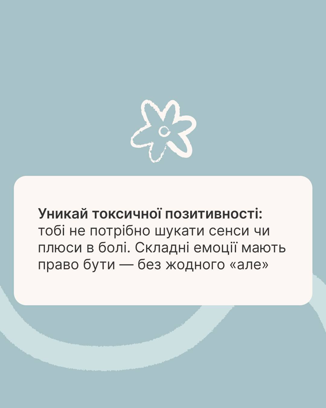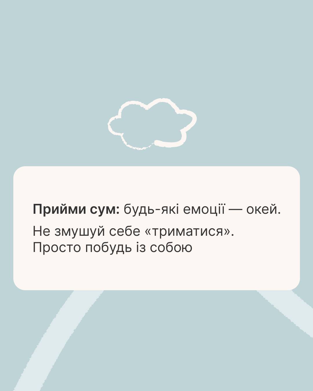 Дозвольте собі виражати сум. Нереалістично очікувати, що ви будете позитивно налаштовані цілодобово та завжди готові до труднощів. Сум також потребує вираження в безпечний для вас та інших спосіб. Наприклад, побути наодинці, поспівати ліричні пісні, почитати поезію, помалювати або ж поплакати.