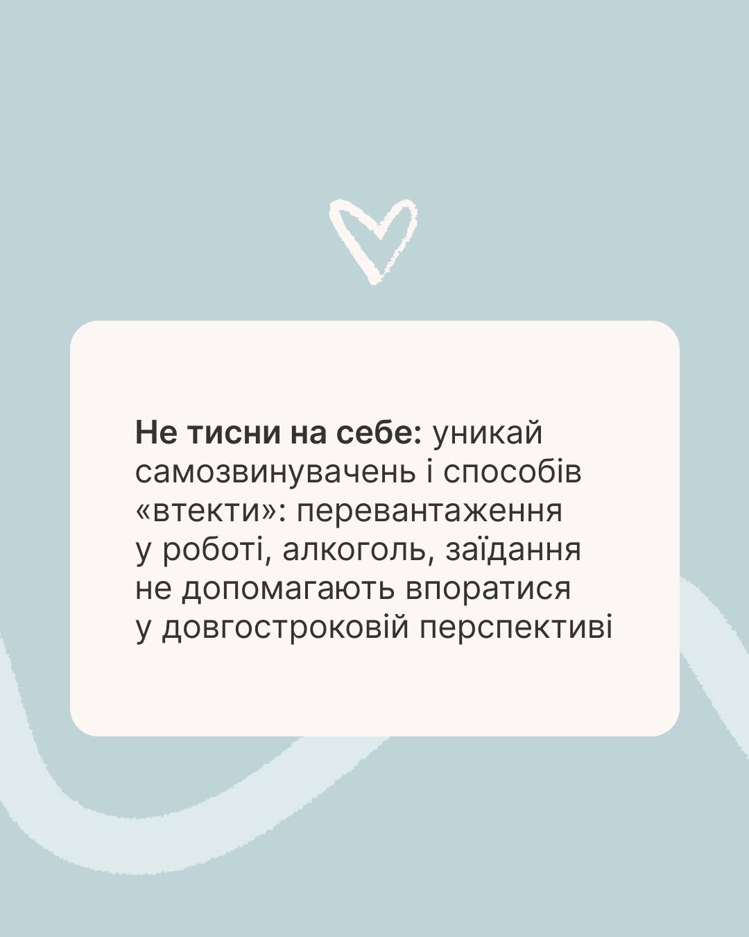 Уникайте деструктивних способів для проживання емоцій, як-от алкоголь, куріння, наркотики, заїдання / недоїдання чи надмірне завантаження себе роботою.