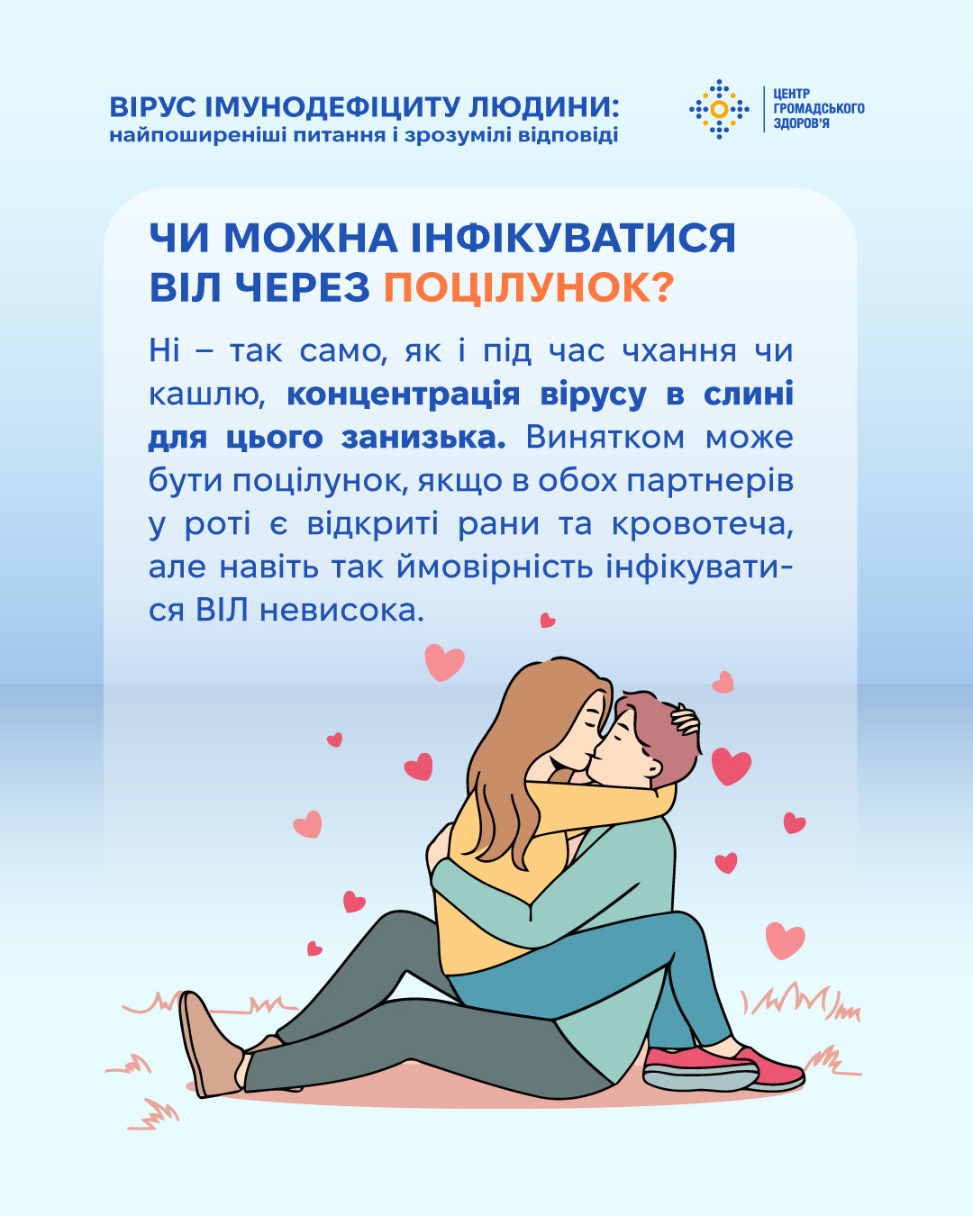 Через поцілунок ВІЛ не передається, як і під час чхання чи кашлю. Вірус не живе у слині в такій концентрації, щоб спричинити інфікування. Винятком може бути ситуація, за якої в обох партнерів у роті є відкриті рани та кровотеча. Але навіть у таких випадках ризик інфікуватися ВІЛ вкрай низький.