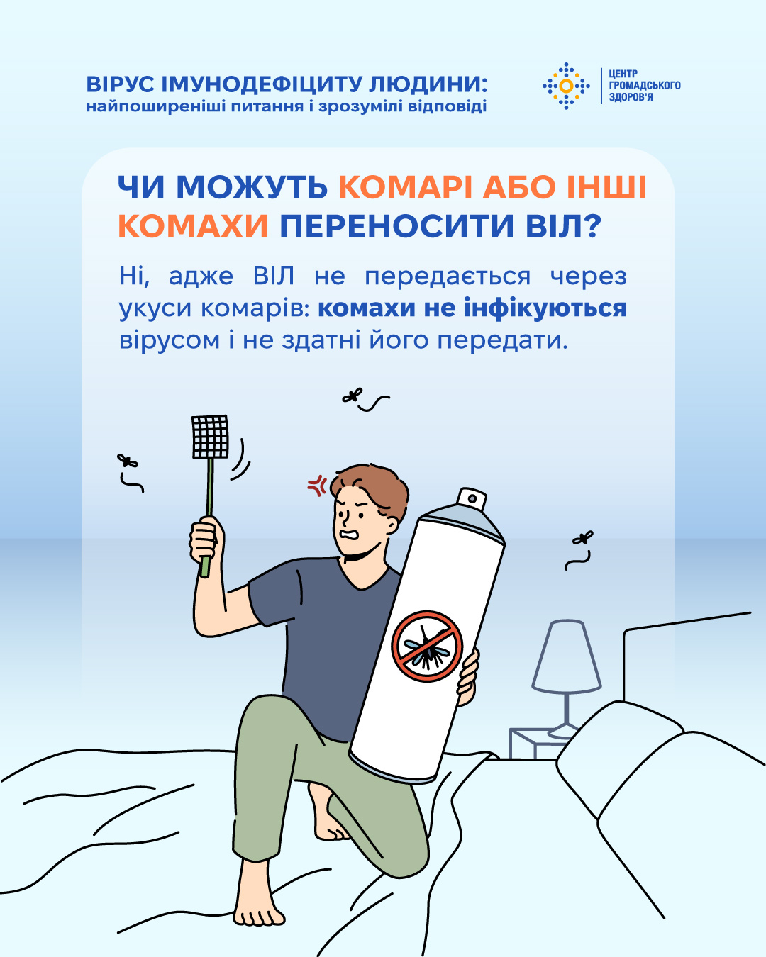 ВІЛ не передається через укуси комах. Комар, чи будь-яка інша комаха, не інфікуються вірусом і не здатні його передати.