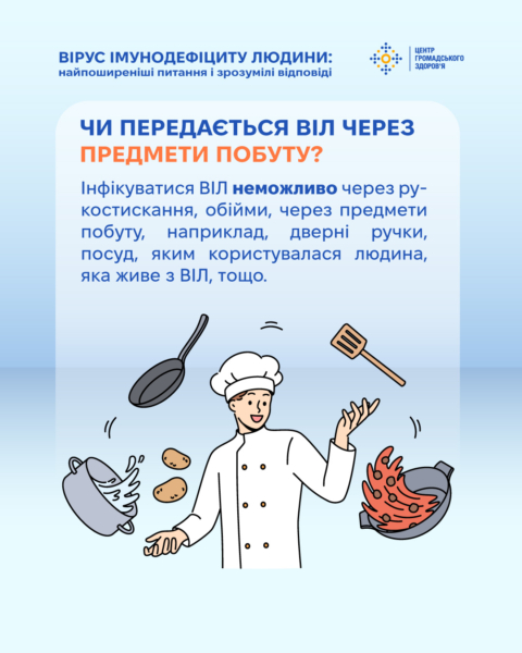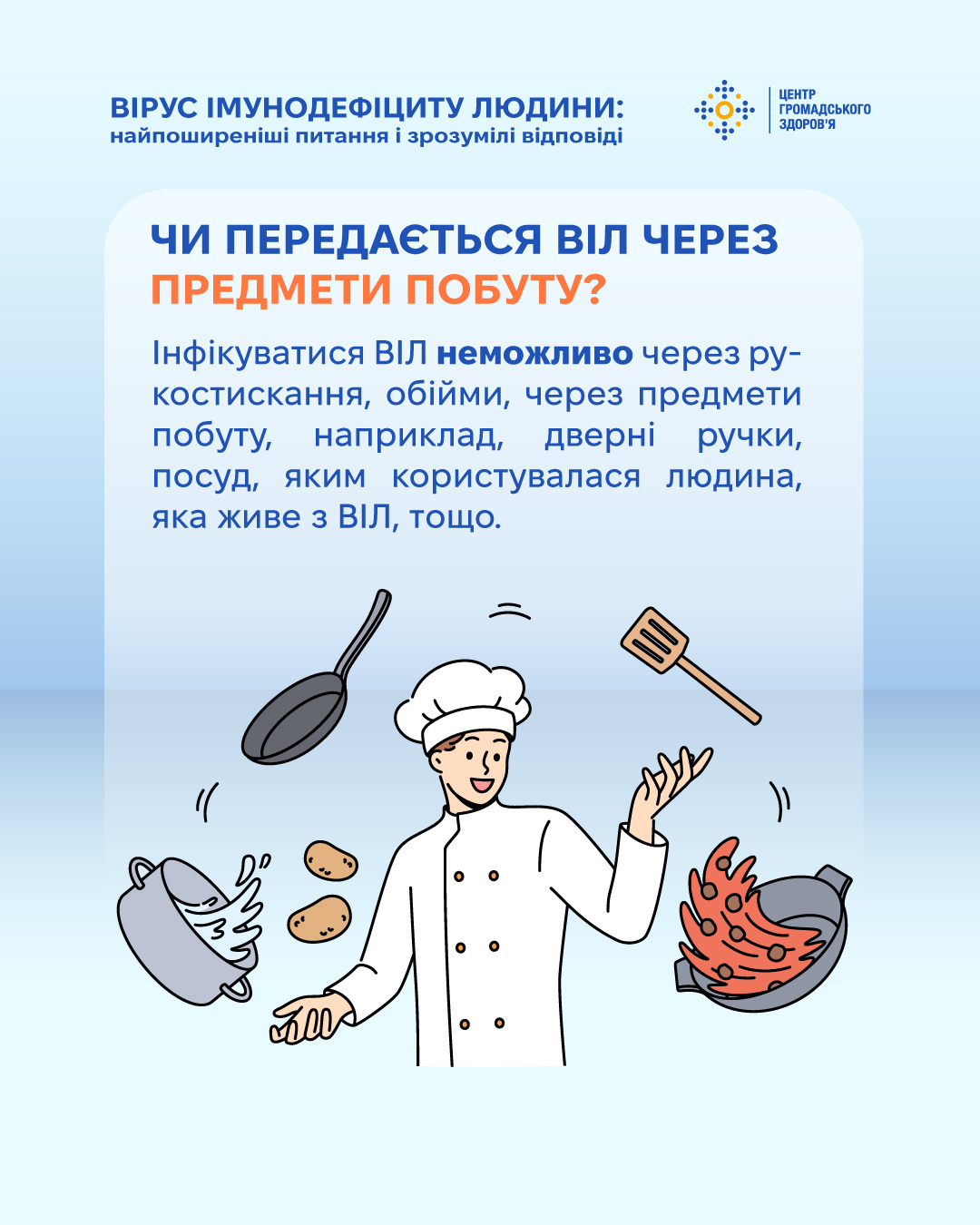 Інфікуватися ВІЛ неможливо через рукостискання, обійми, через предмети побуту, наприклад, дверні ручки, сидіння унітазів, побутові предмети або посуд, якими користувалася людина, яка живе з ВІЛ.