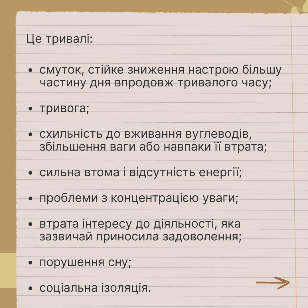 «Дзвіночки», які сигналізують про нього, — це тривалі втома, пригніченість, зниження інтересу до повсякденних справ, надмірний сон та зміна апетиту. А також ознаки зі списку в каруселі.