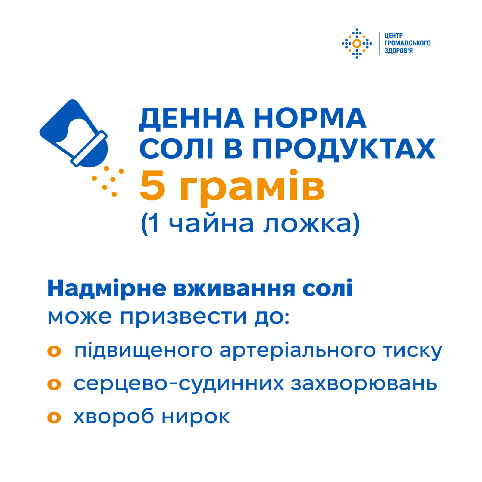 Українці вживають 12,6 г солі на добу, про це свідчать результати національного дослідження STEPS у 2019 році. Тоді як денна норма солі в продуктах — до 5 грамів на день.