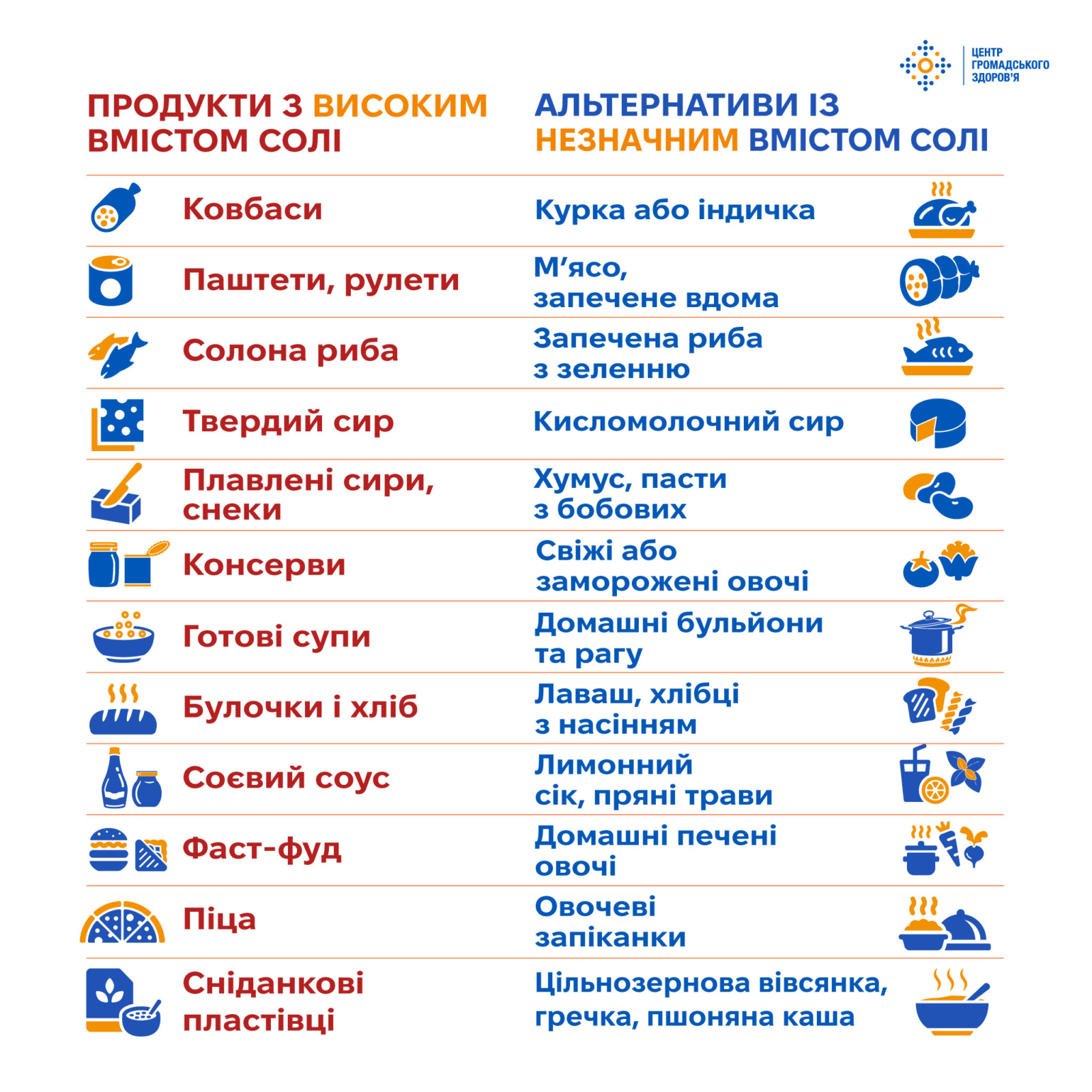 Щодня з готовою їжею ми вживаємо багато солі, часто не помічаючи цього. Контролюйте, скільки солі ви додаєте у страви під час приготування. Це також стосується домашніх соусів, консервації тощо, а традиційні продукти з високим вмістом солі максимально замінюйте альтернативними, кориснішими продуктами.