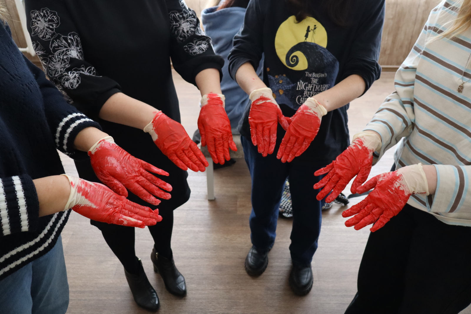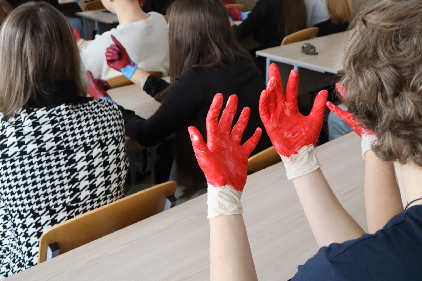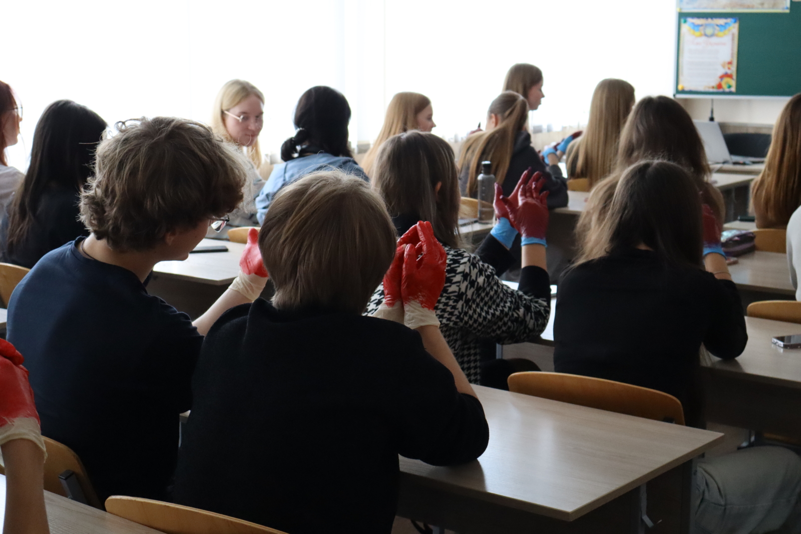 За допомогою рукавичок та акрилової фарби учні побачили, як мило наноситься на руки, скільки його потрібно та які техніки правильного миття рук.