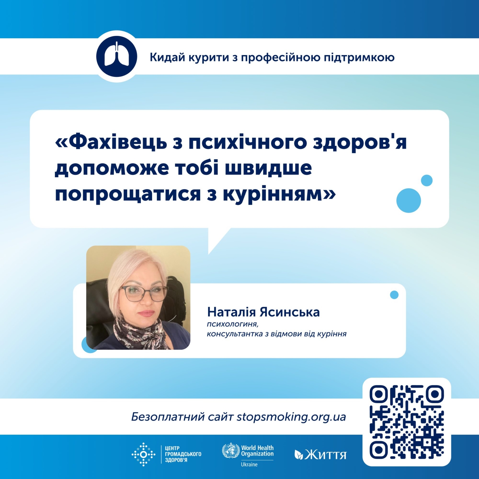 «Боротьба з тютюновою залежністю – це шлях сили та подолання власних страхів. Тому дуже важливо мати поруч людей, які підтримують і вірять у тебе. Не соромся звернутися до сімейного лікаря, який допоможе створити план відмови та за необхідності призначить медикаменти. А кваліфікований психолог або психотерапевт навчить працювати з емоційними питаннями, пов’язаними з відмовою від куріння, та розробить індивідуальні рекомендації щодо подолання тяги до сигарет», – наголошує Наталія Ясинська, психологиня, консультантка з відмови від куріння.
