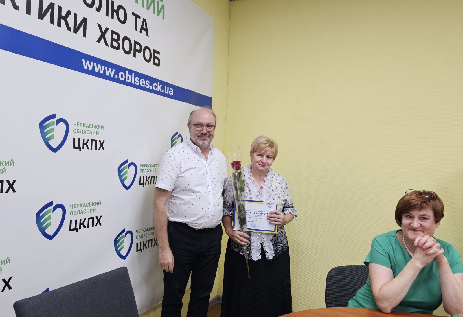 Почесними грамотами Міністерства охорони здоров’я України за вагомий особистий внесок у розвиток охорони здоров’я та високий професіоналізм нагородили Ніну Єгольнікову – завідувачку відділу лабораторних досліджень Черкаського обласного ЦКПХ, Наталію Щербину – завідувачку Чигиринського відділення Черкаського міськрайонного відділу, подякою МОЗ Валентину Трюхан – біолога Канівського відділення Черкаського міськрайонного відділу.