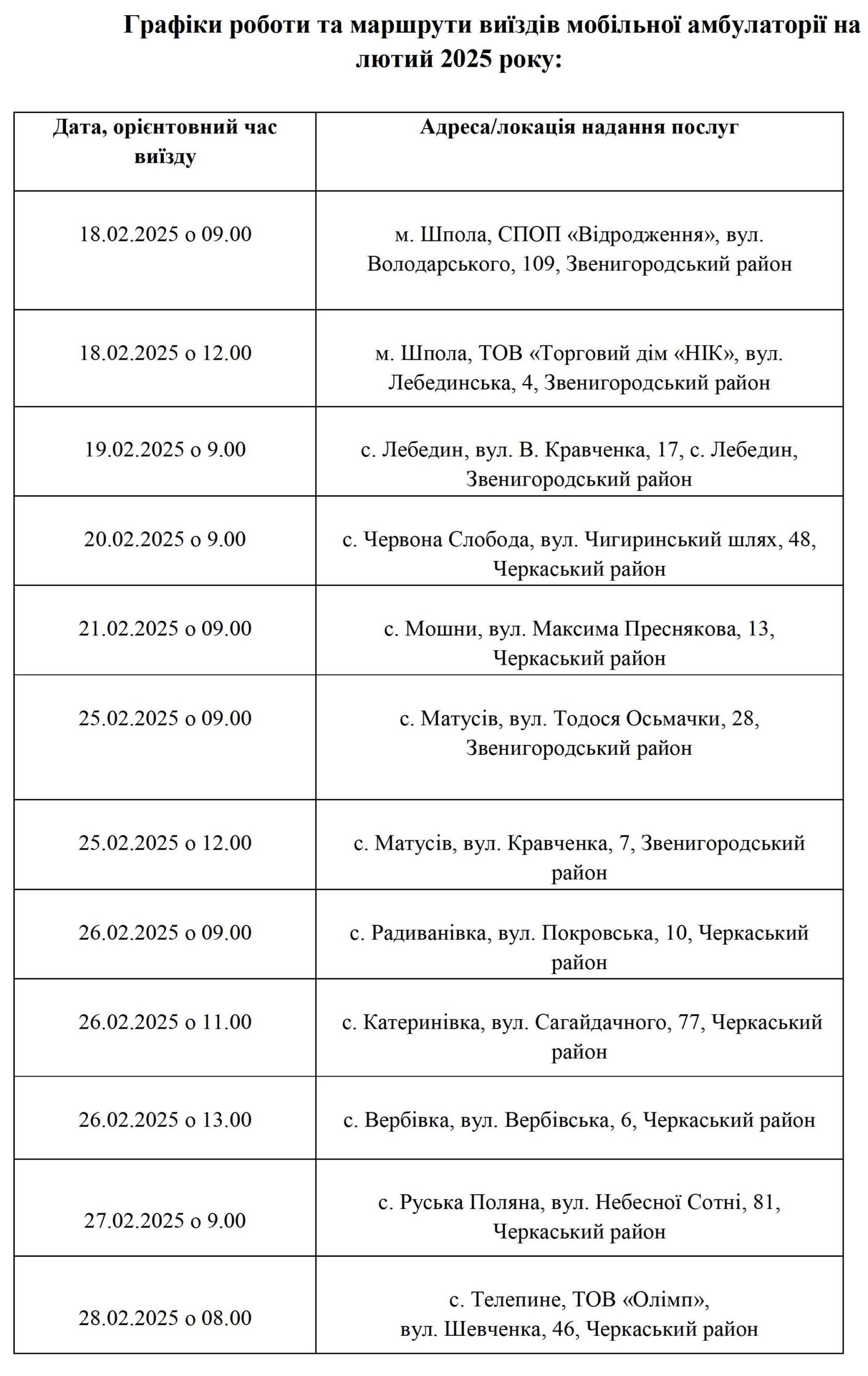 Графік виїздів мобільної амбулаторії Черкаського обласного ЦКПХ для безоплатних послуг із тестування і профілактики соціально значущих хвороб