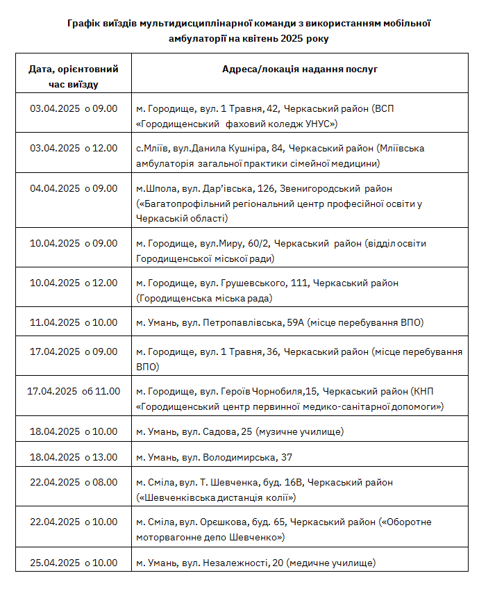 Графік виїздів мобільної амбулаторії Черкаського обласного ЦКПХ на квітень 2025 року для безоплатних послуг із тестування і профілактики соціально значущих хвороб