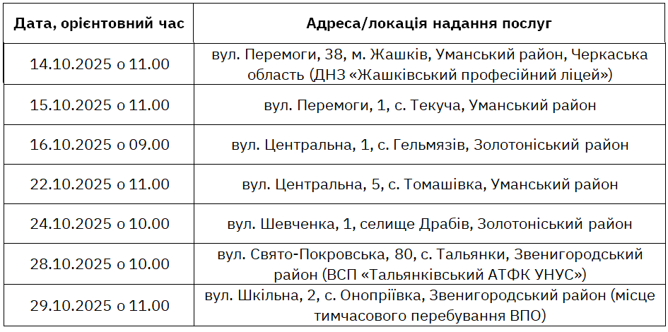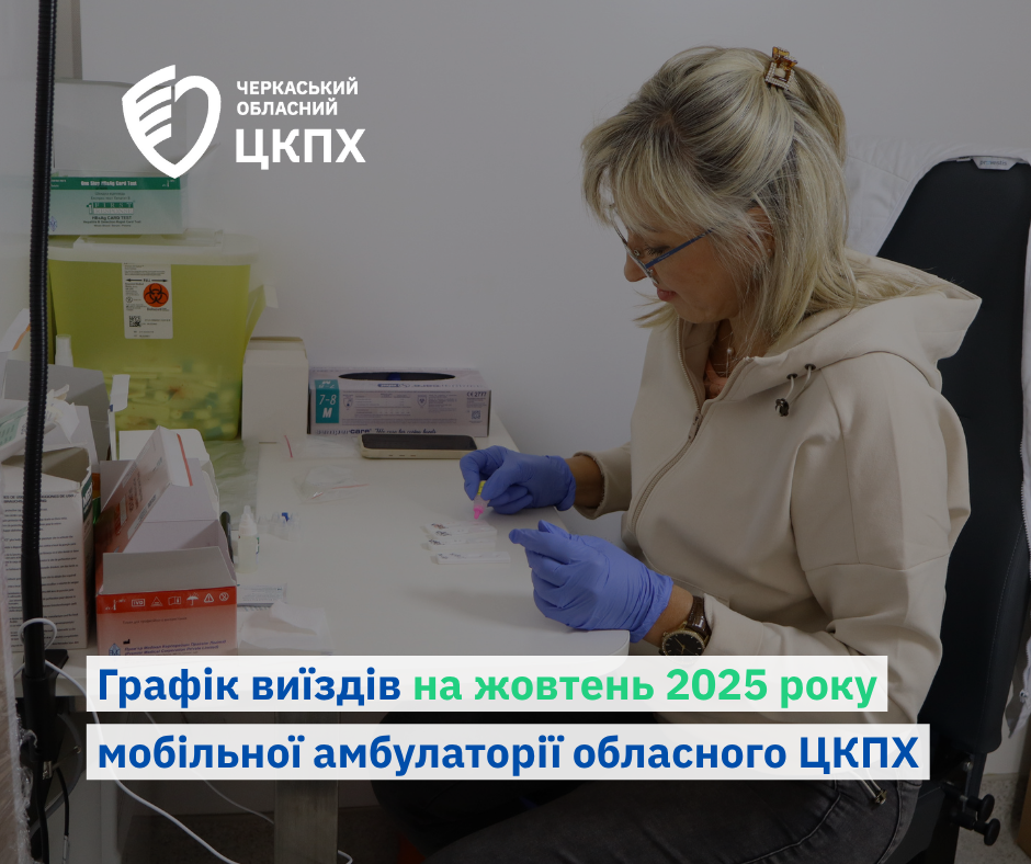Графік виїздів мобільної амбулаторії Черкаського обласного ЦКПХ на жовтень 2025 року для безоплатних послуг із тестування й профілактики соціально значущих хвороб