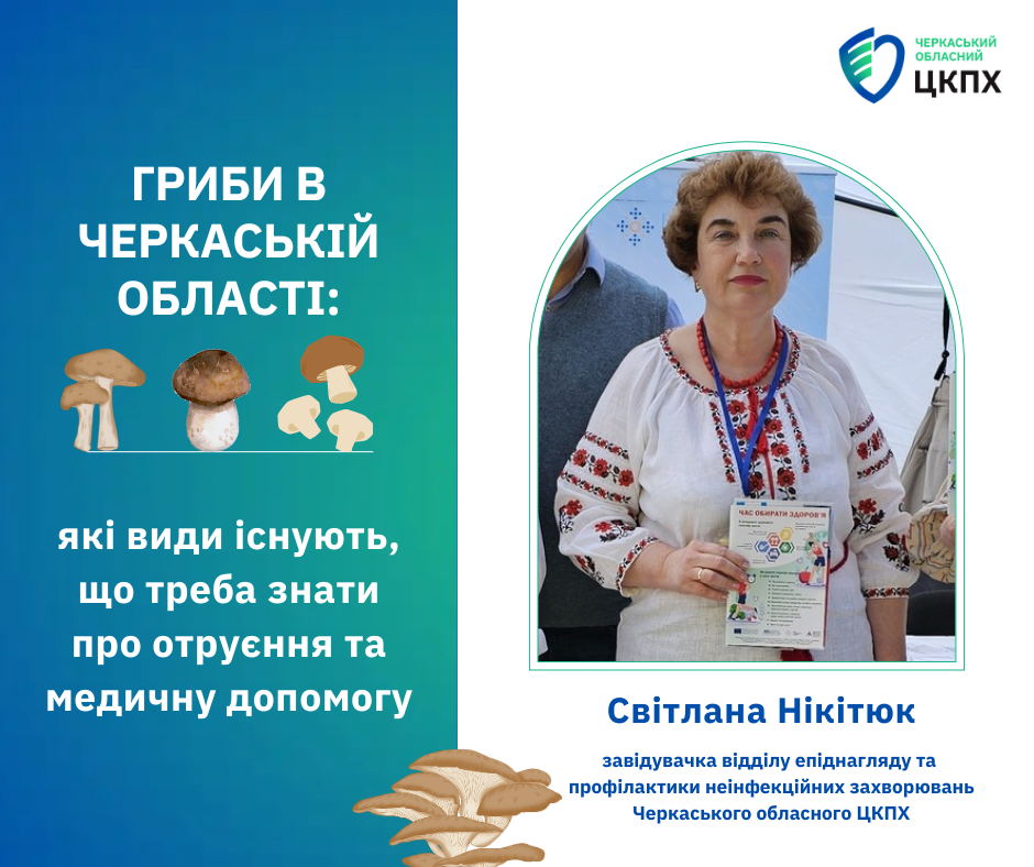 – Я як медик і фахівець Центру контролю та профілактики хвороб хочу закликати всіх жителів Черкаської області відмовитися від споживання дикорослих грибів як від продукту взагалі. Пропоную вживати штучно вирощені печериці, гливи, які можна купити в магазині. Закликаю берегти своє здоров’я, не ризикувати життям, – підсумувала завідувачка відділу епіднагляду та профілактики неінфекційних захворювань Світлана Нікітюк.