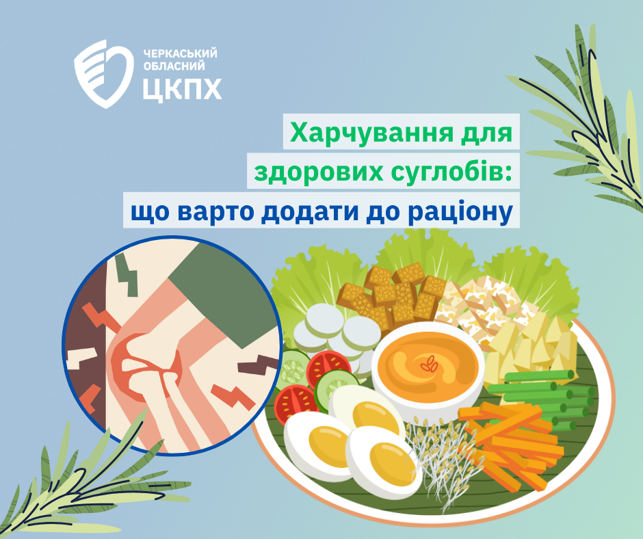 Для здоров’я суглобів важливо включати до раціону продукти, які підтримують хрящову тканину, зменшують запалення та забезпечують організм необхідними поживними речовинами. Ось ключові рекомендації щодо харчування від фахівців відділу епіднагляду та профілактики неінфекційних захворювань Черкаського обласного центру контролю та профілактики хвороб: