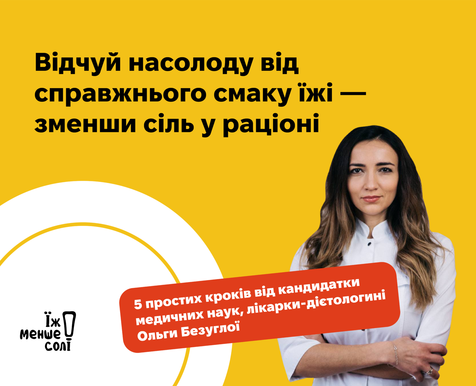 Пропонуємо 5 простих кроків, які допоможуть тобі скоротити споживання солі вже сьогодні, від кандидатки медичних наук, лікарки-дієтологині Ольги Безуглої.