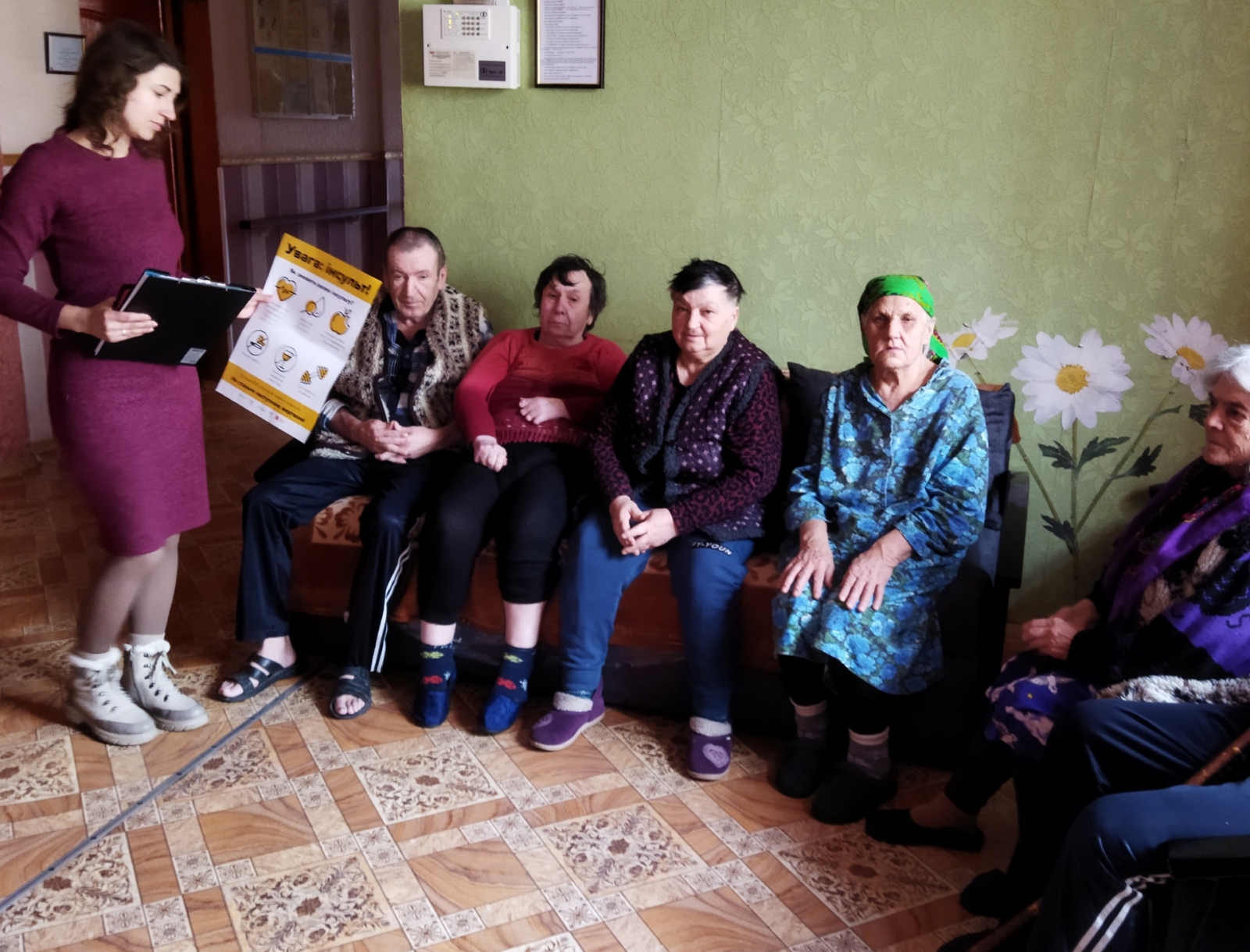 У відділенні стаціонарного догляду для постійного або тимчасового проживання Центру надання соціальних послуг спеціалісти Чорнобаївського відділення обговорювали з жителями фактори ризику інсультів та інфарктів, важливість своєчасного звернення за медичною допомогою та вплив здорового харчування на організм людини.