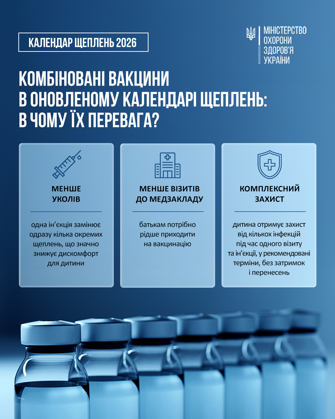 Оновлений Календар профілактичних щеплень, який набуде чинності з 1 січня 2026 року, передбачає ширше використання сучасних комбінованих вакцин. Такі вакцини захищають від кількох інфекцій одночасно. Саме комбіновані вакцини використовують більшість країн ЄС.