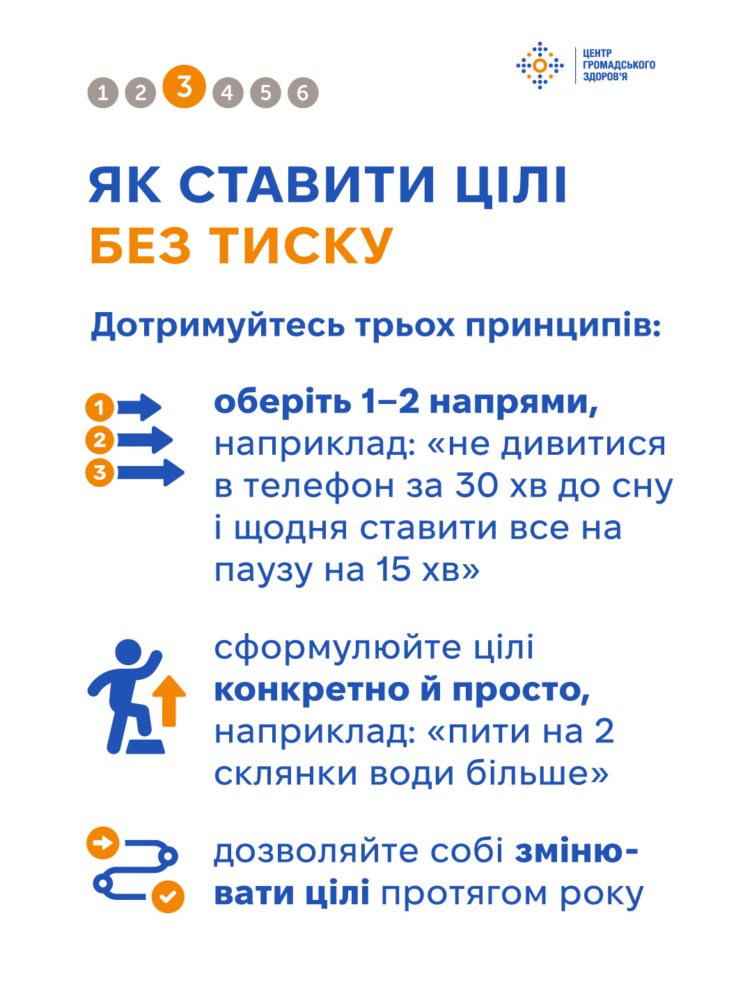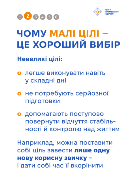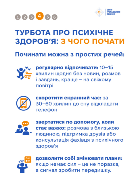Окремо звертаємо увагу на скорочення екранного часу. Постійне користування телефоном, особливо ввечері, може погіршувати сон і підвищувати рівень тривоги. Здійсненна ціль — за 30–60 хвилин до сну відкладати телефон або хоча б не читати новини в цей час.