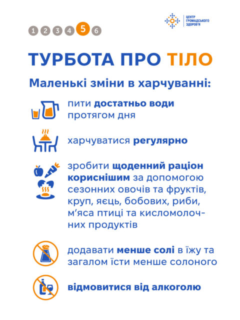 Ще один крок — харчуватися регулярно. Навіть у напружені дні варто намагатися їсти хоча б тричі на день. Це допоможе підтримувати енергію на достатньому рівні й уникати коливань рівня глюкози в крові, які впливають на самопочуття.