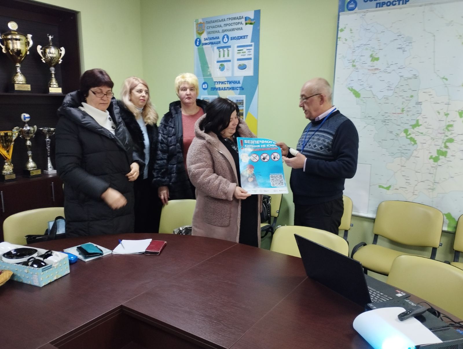 Фельдшер санітарний Валерій Ковтун та помічник лікаря-епідеміолога Ігор Грабчак Уманського міськрайонного відділу Черкаського обласного центру контролю та профілактики хвороб зустрілись із директорами закладів освіти Паланської громади. У ході зустрічі обговорили актуальні теми: «Важливість здорового способу життя у профілактиці онкозахворювань» та «Профілактика метапневмовірусної інфекції».