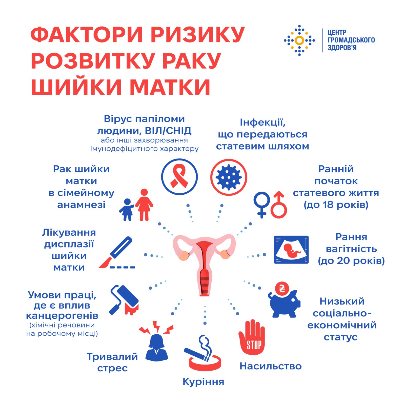 Центр громадського здоров’я пояснює взаємозв’язок факторів ризику із розвитком виникнення раку шийки матки (РШМ).