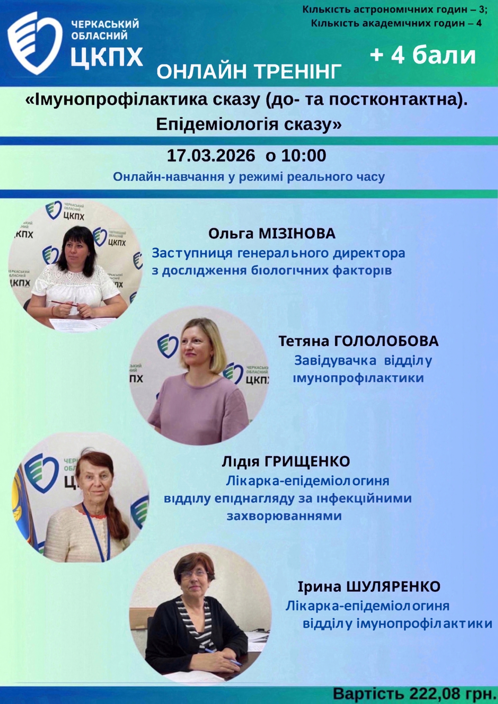 17 березня 2026 року о 10:00 відбудеться онлайн-семінар у режимі реального часу «Імунопрофілактика сказу (до- та постконтактна). Епідеміологія сказу», організований ДУ «Черкаський обласний центр контролю та профілактики хвороб МОЗ України». Захід проходитиме на платформі Zoom, тривалість становитиме 3 астрономічні (4 академічні) години.