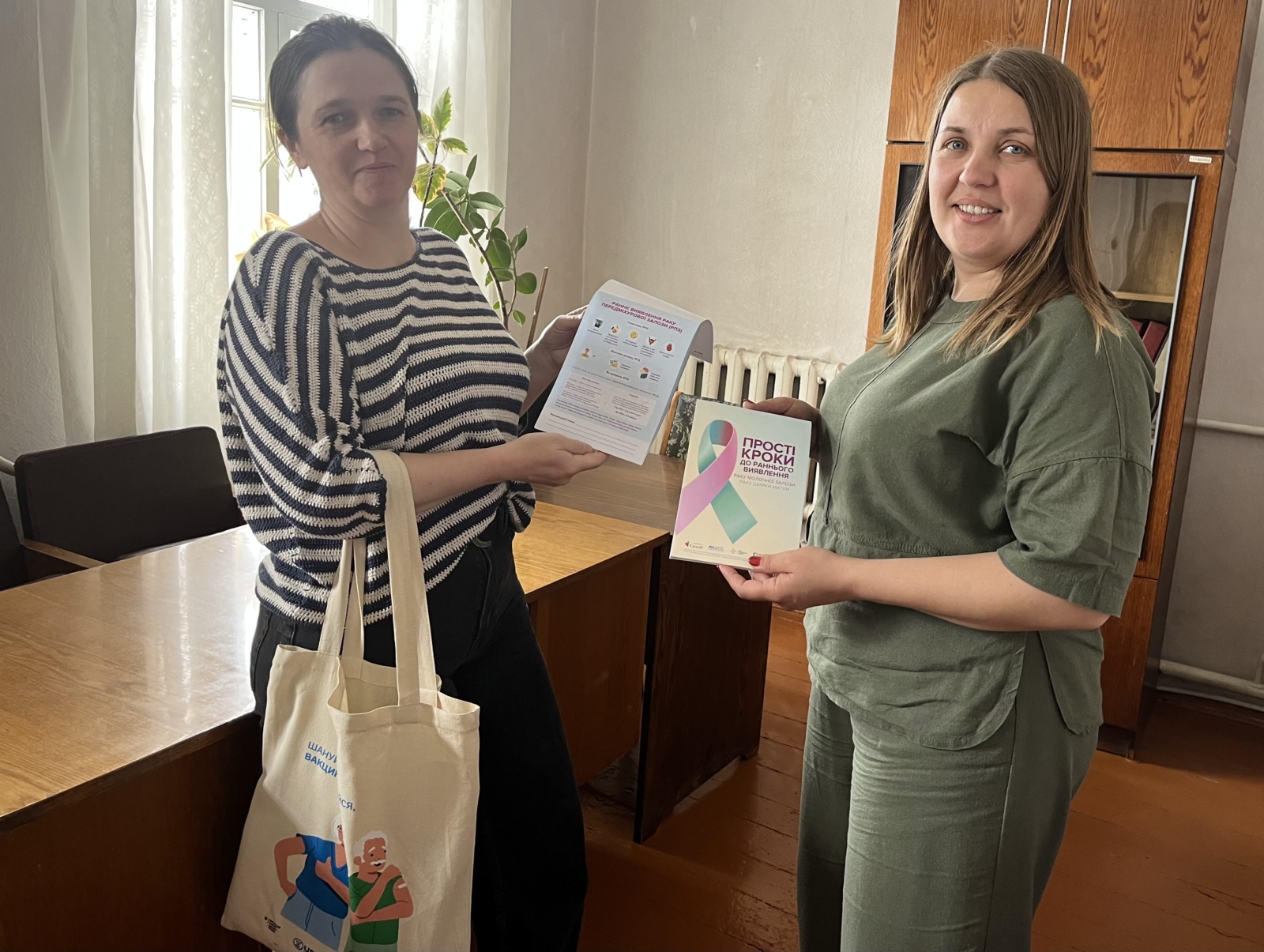 Сімейним лікарям передали відривні блокноти «Прості кроки до раннього виявлення раку передміхурової залози, раку молочної залози, раку шийки матки». А відвідувачам закладу надали інформаційно-просвітницькі матеріали, що містять практичні поради щодо самообстеження та ведення здорового способу життя.