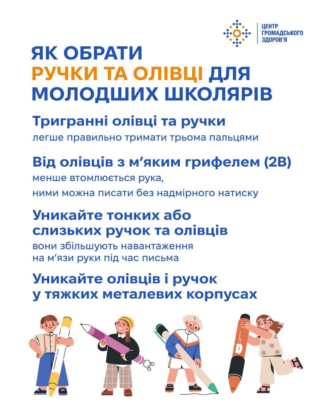 - Варто уникати надто тонких або слизьких ручок та олівців, оскільки вони збільшують навантаження на м’язи руки під час письма. Також краще відмовитись від приладдя у тяжких металевих корпусах.