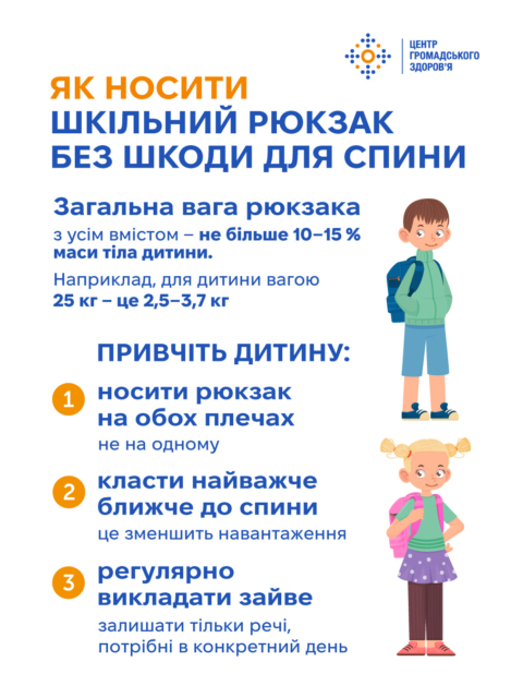 - Радьте дитині завжди носити рюкзак на обох плечах, а не на одному.