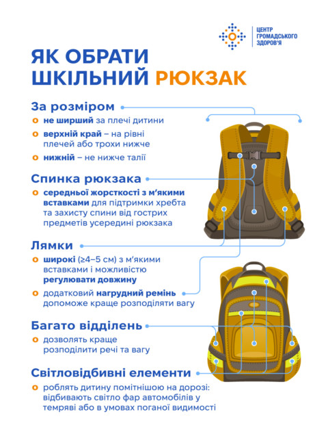 - За розміром рюкзак має бути не ширший за плечі дитини. Верхній край — на рівні плечей або трохи нижче, а нижній — не опускатися нижче талії.