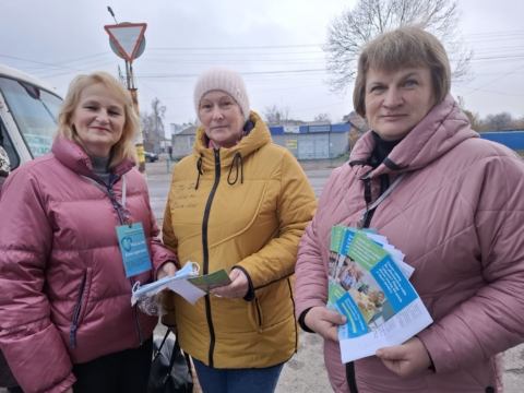 Завідувачка відділення Наталія Бондаренко та фахівці Людмила Кузьміна і Анатолій Шкляр розповідали перехожим про запобігання гострим респіраторним вірусним інфекціям, які можуть призвести до ускладнень, зокрема пневмонії.