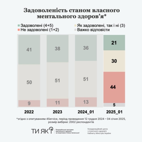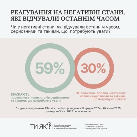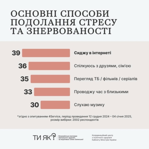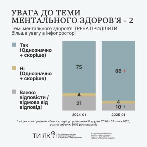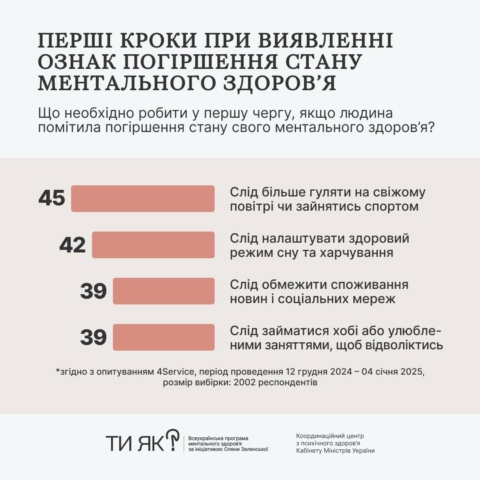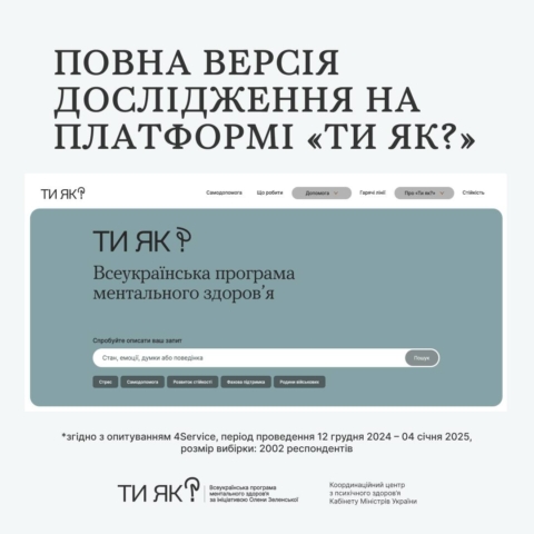 Cпівчуття замість критики ментальних проблем. Бажання поступово «відкриватися» фахівцям та конструктивні методи подолання стресу. Про це — результати четвертої хвилі всеукраїнського дослідження, проведеної у грудні 2024-січні 2025 року в межах Всеукраїнської програми ментального здоров’я «Ти як?» ініціативи першої леді Олени Зеленської.