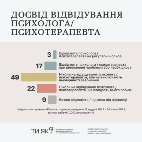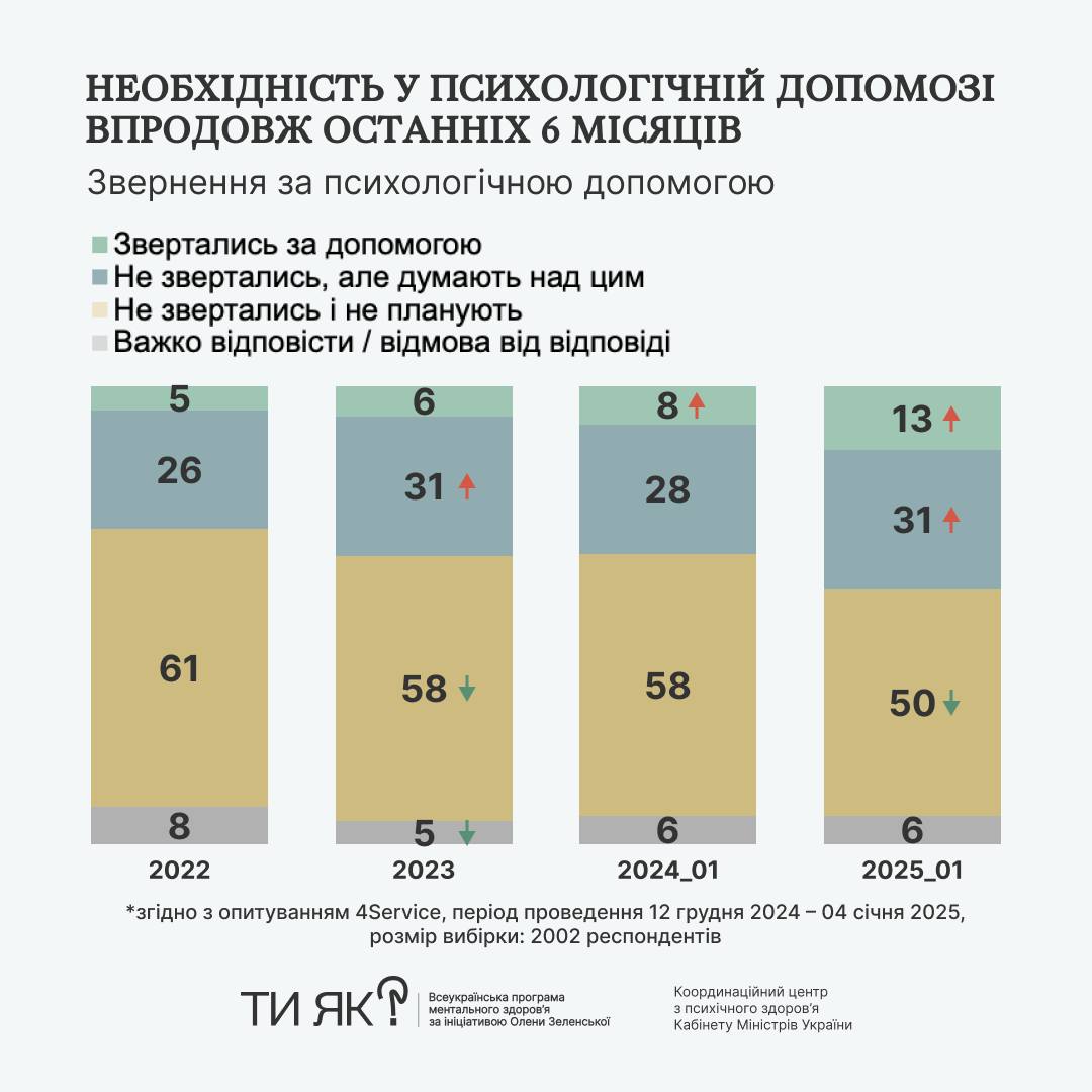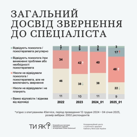 - Частка тих опитаних, хто вже звертається до психологів або психотерапевтів, збільшилась із 7% у 2022 році до 17% на початку 2025 року.