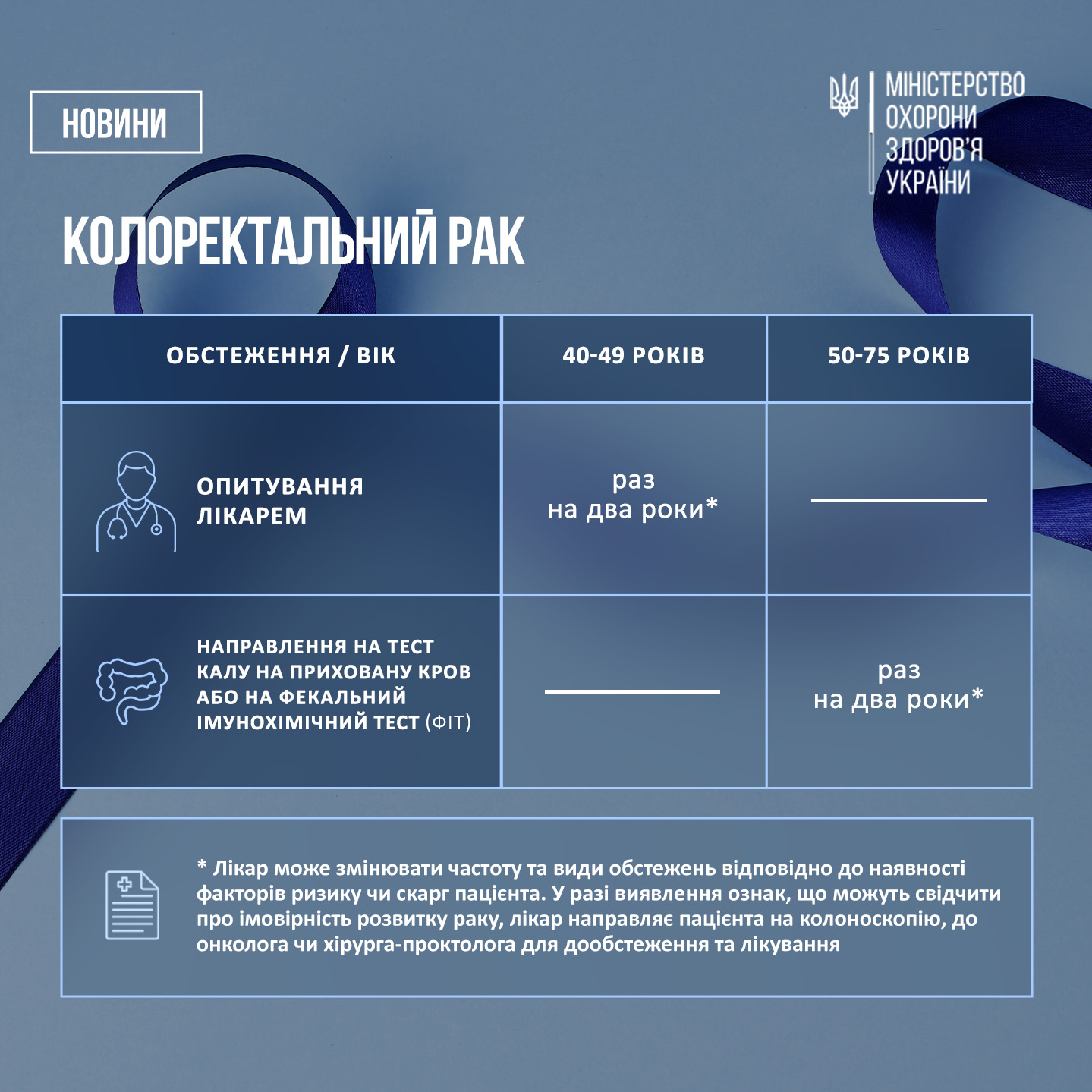 Для людей у віці 50-75 років рекомендований огляд та направлення на тест калу на приховану кров або на фекальний імунохімічний тест (ФІТ) – кожні 2 роки, а за наявності факторів ризику – щороку. Якщо результат тесту позитивний – направлення на колоноскопію та консультацію до хірурга-проктолога або онколога.