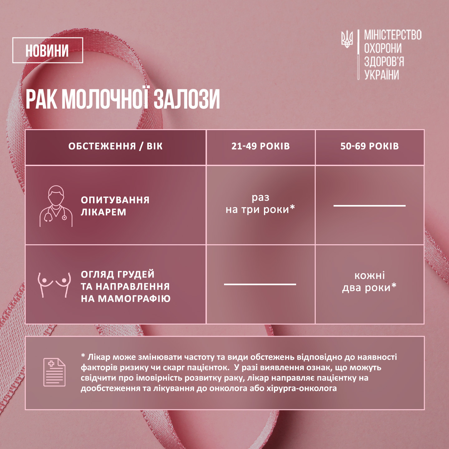 Для жінок 50-69 років – огляд та пальпація молочних залоз і направлення на мамографію – кожні два роки.