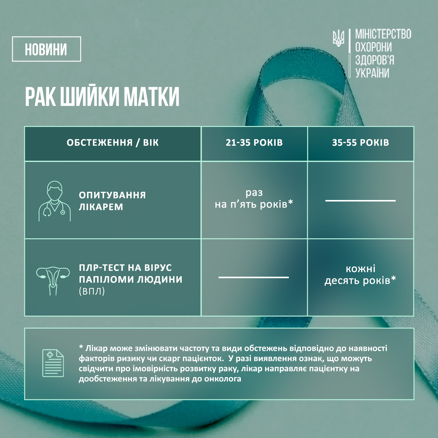 Для жінок віком від 35 років – ПЛР-тест на ВПЛ з генотипуванням щонайменше 1 раз на 10 років.